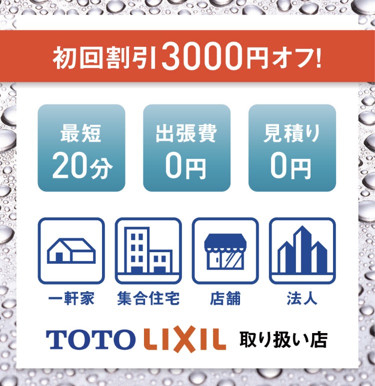 水漏れ 詰まり 蛇口 シングルレバー 単水栓 トイレタンク ボールタップ フロート レバー 止水栓 メーター 便器 和式 洋式 便座 ウォシュレット リモコン トイレつまり 排水つまり トイレに物を落とした 便器と床の間から水漏れ トイレの床下から水漏れ 便器交換 トイレリフォーム 洗面化粧台 三面鏡 洗髪シャワー 浄水器 お風呂 浴室 バスルーム 湯沸かし器 システムキッチン ユニットバス 給湯器 井戸ポンプ 深井戸 浅井戸 水中ポンプ ジェット 洗濯機 防水パン 移設 食器洗い乾燥機 食洗器 分岐 引っ越し TOTO INAX LIXIL KVK モエン サンエー 水が出ない お湯が出ない 水が止まらない 自分で対処法